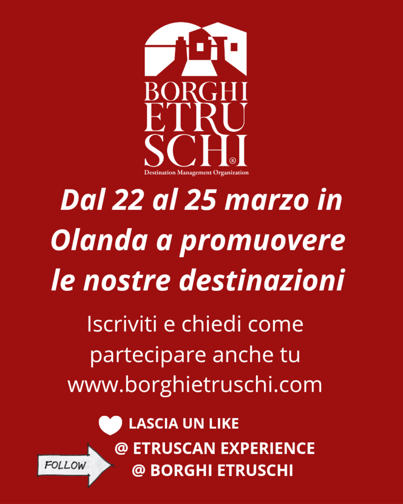 Borghi Etruschi DMO Associazione per la Promozione Turistica C SCOPRI GLI ETRUSCHI TOUR VIAGGI EXPERIENCE TOUR EVENTI Scopri di più > I Borghi INFO STORIA CURIOSITÀ Scopri di più > Cammini e Itinerari INFO STORIA CURIOSITÀ Scopri di più > Chi Siamo PARTNER FINALITÀ Scopri di più > EVENTI – NEWS NewsUn marchio registratoUn Marchio Registrato Borghi Etruschi Abbiamo comunicato a vari comuni che questo marchio, Borghi Etruschi è registrato, non può essere utilizzato a piacimento e senza autorizzazione. Nonostante... SCOPRI di più NewsDMO Borghi Etruschi promuove in Olanda le sue destinazioniDMO Borghi Etruschi in Olanda Una Road Map per fare incrementare il flusso di turisti olandesi nei siti etruschi SCOPRI di più